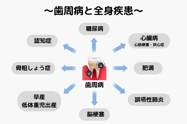 歯周病は、糖尿病や心筋梗塞、脳梗塞といった全身疾患にも関与することがわかっています。